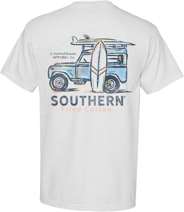 - An white short sleeve pocket t shirt with a wrangler SUV & surfboards and the Southern Fried Cotton logo on back. Southern Fired Cotton logo on left chest pocket. Made from 100% ring spun USA cotton. Preshrunk, soft-washed, garment-dyed fabric. Made with sustainably and fairly grown USA cotton and sewn with USA cotton thread. Unisex sizing.
