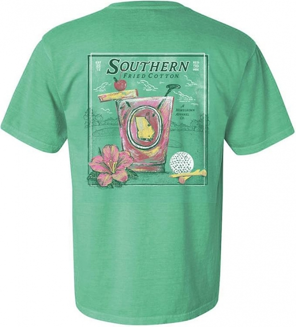 - An island green short sleeve pocket t shirt with an azalea cocktail in a golf stamp and the Southern Fried Cotton logo on back. Southern Fired Cotton logo on left chest pocket. Made from 100% ring spun USA cotton. Preshrunk, soft-washed, garment-dyed fabric. Made with sustainably and fairly grown USA cotton and sewn with USA cotton thread. Unisex sizing.